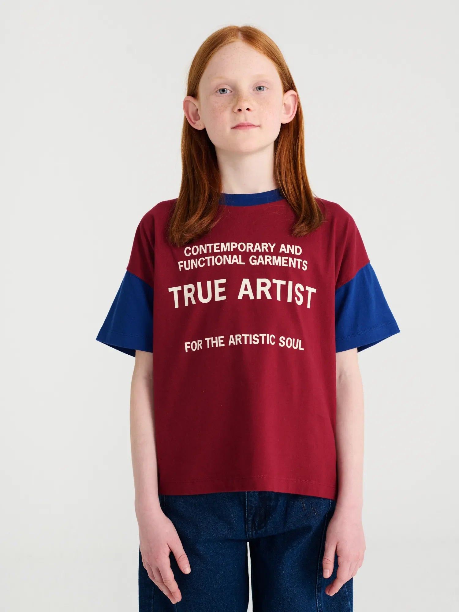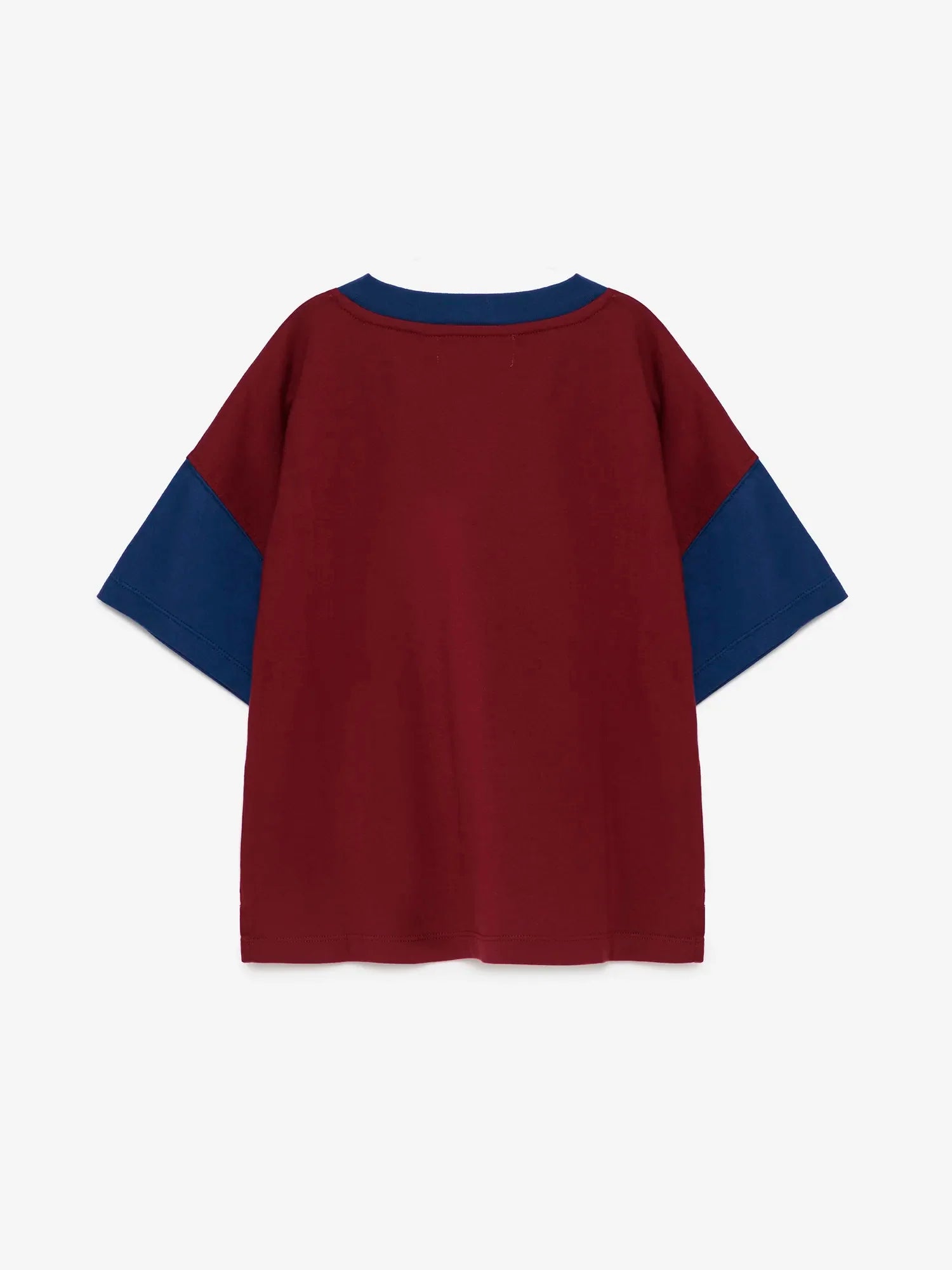 T-shirt nº18 in Burgundy Red is made of 100% organic cotton. This color block t-shirt is designed with sleeves and collar in contrast blue color and it features the TA brand slogan printed on the front. It has a regular fit. Made in Portugal.