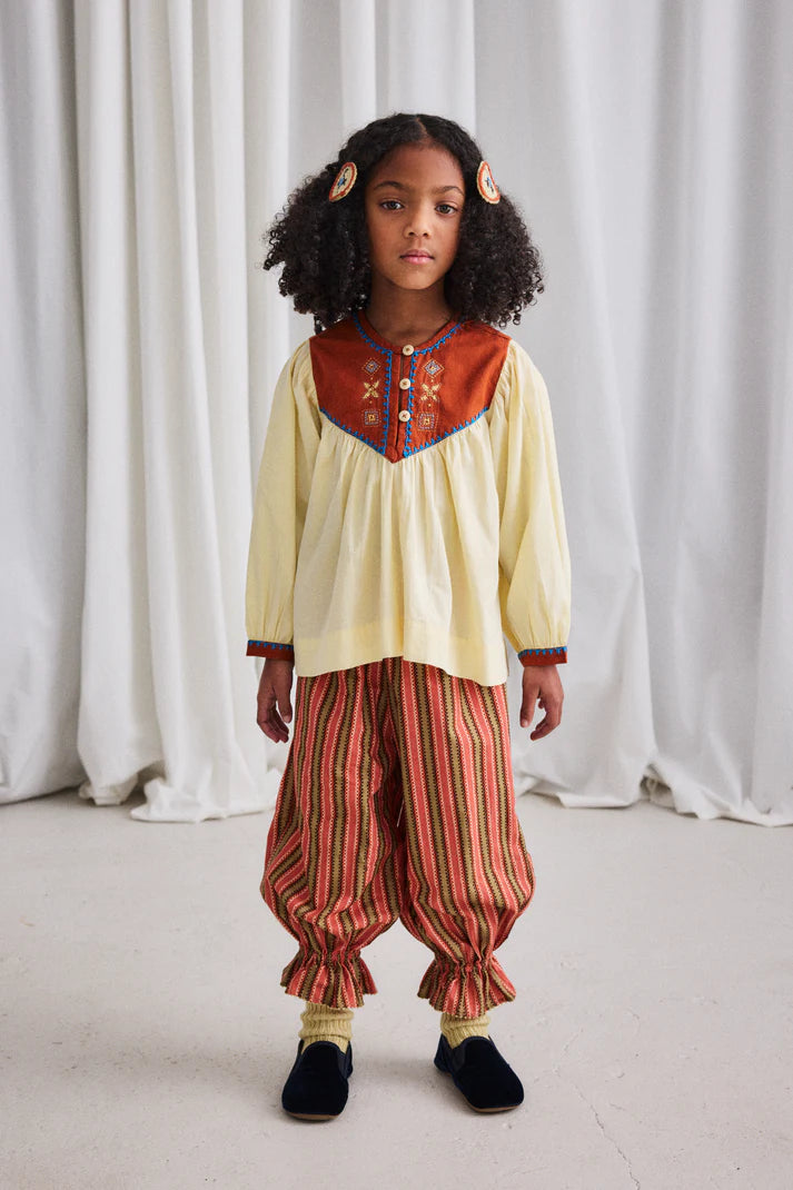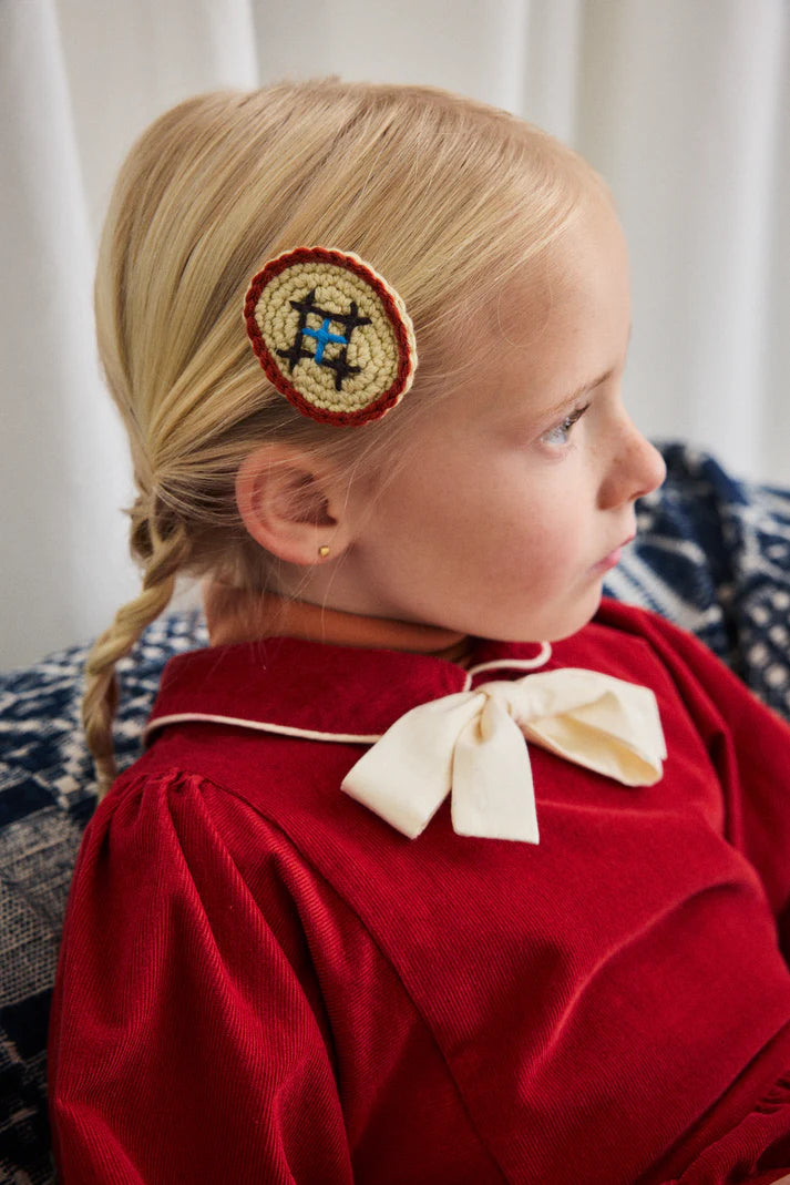 A hand-crocheted clip set in Merino wool, mounted on alligator clips. Finished with hand-embroidered cross-stitch designs.
