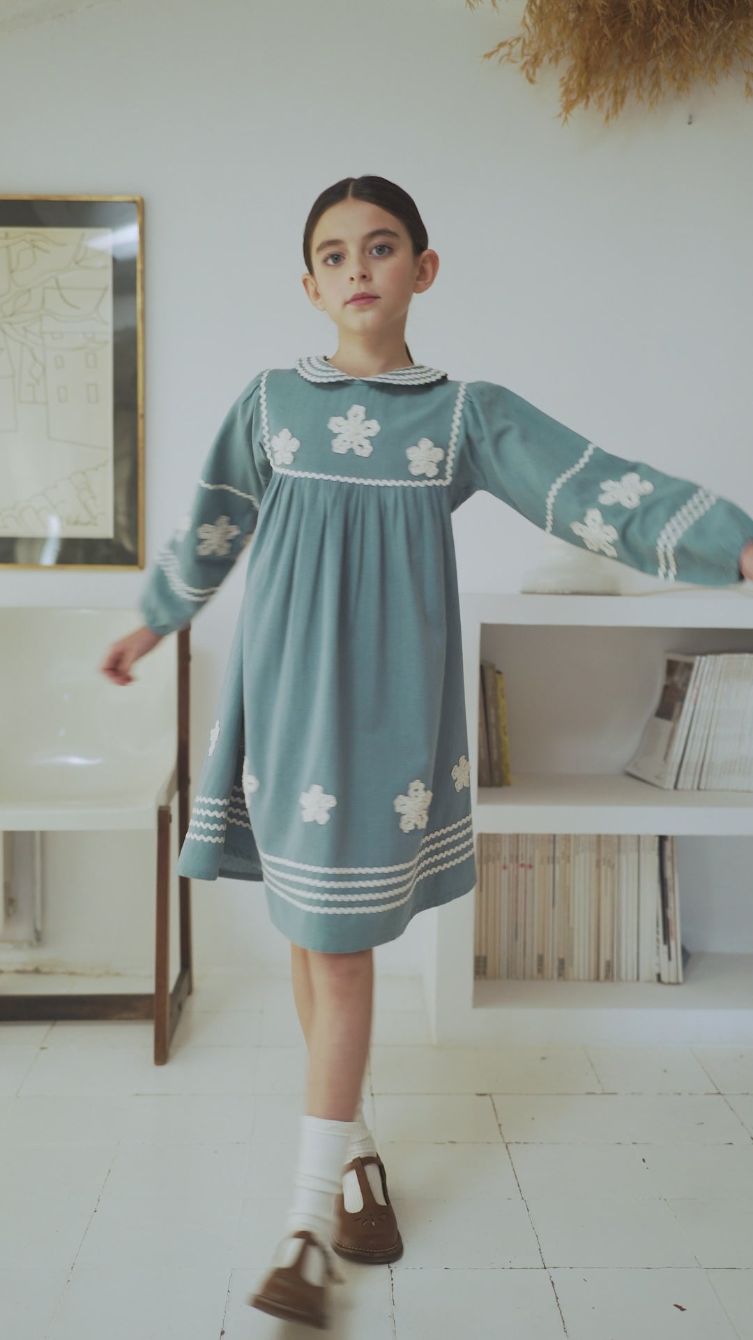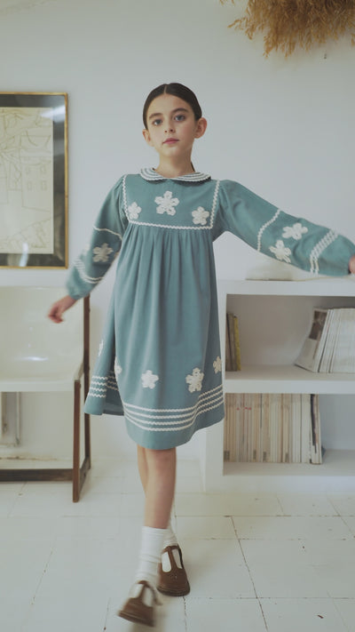 Inspired by the sweetest childhood memories, Inga dress is crafted from the comfiest organic cotton and trimmed with natural white ric rac tape decorations. Adorable Peter Pan collar with balloon puff sleeves and comfortable loose fit.