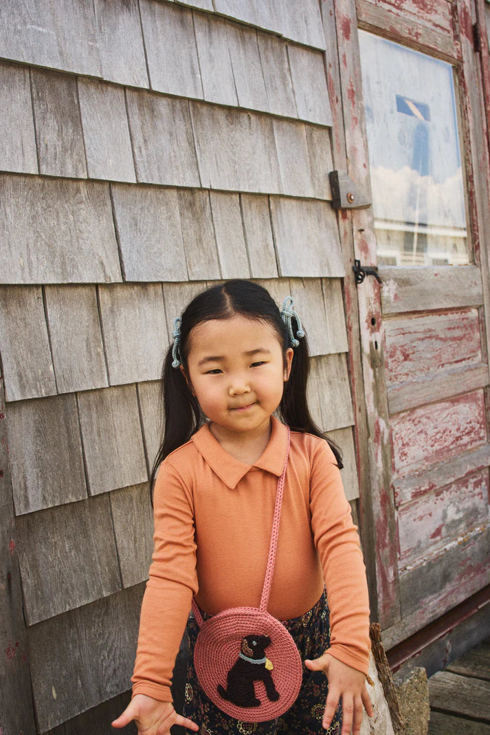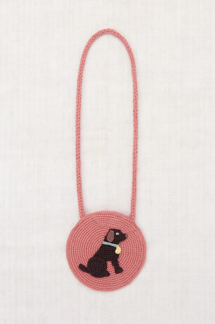 A hand-crocheted bag in Merino wool, featuring a puppy motif on one side, double-layered construction for sturdiness, and a magnetic snap closure.