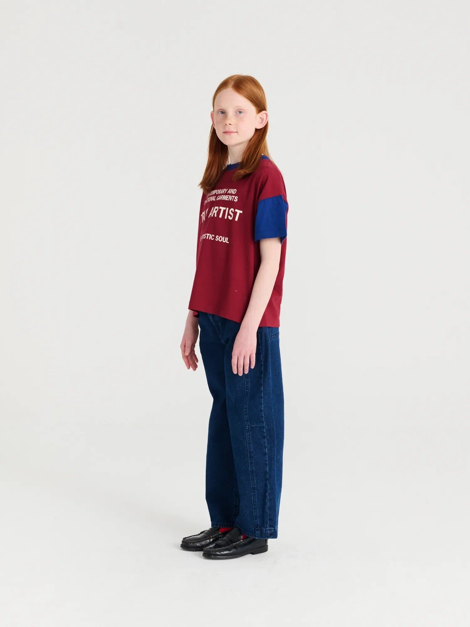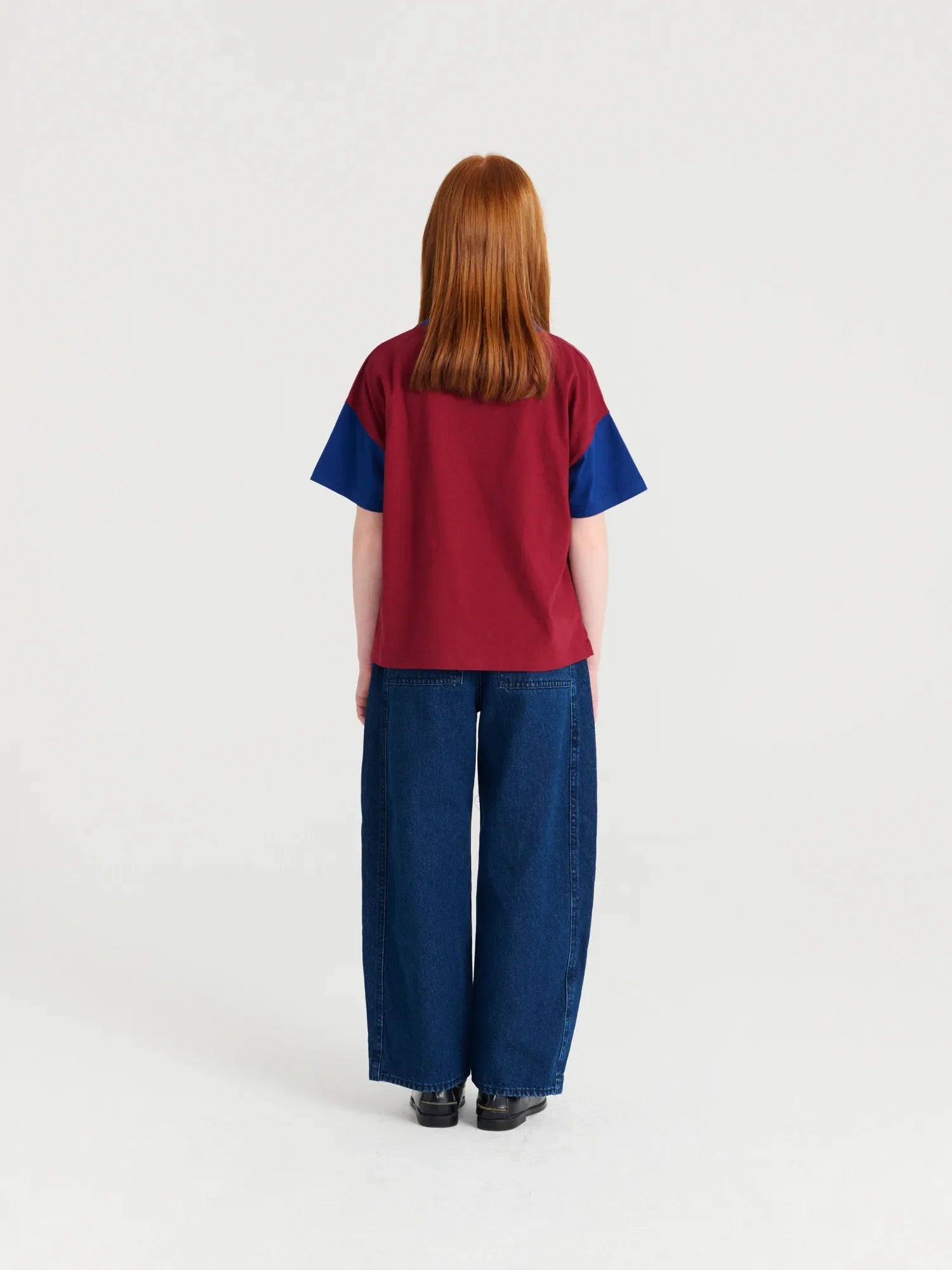 T-shirt nº18 in Burgundy Red is made of 100% organic cotton. This color block t-shirt is designed with sleeves and collar in contrast blue color and it features the TA brand slogan printed on the front. It has a regular fit. Made in Portugal.